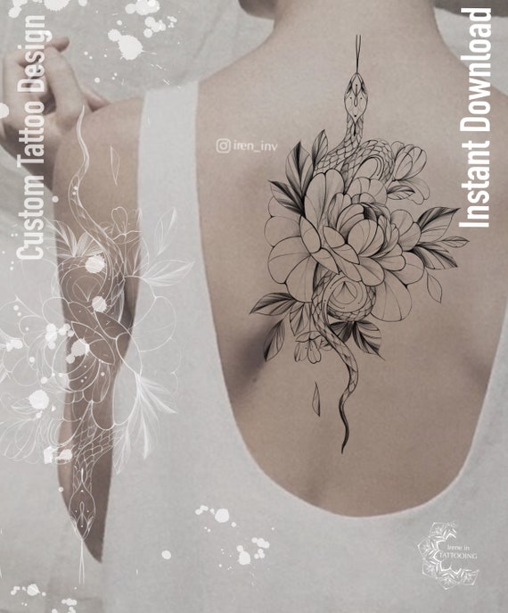 Tattoo Design Printable Stencil Snake With Peony Instant Etsy Israel